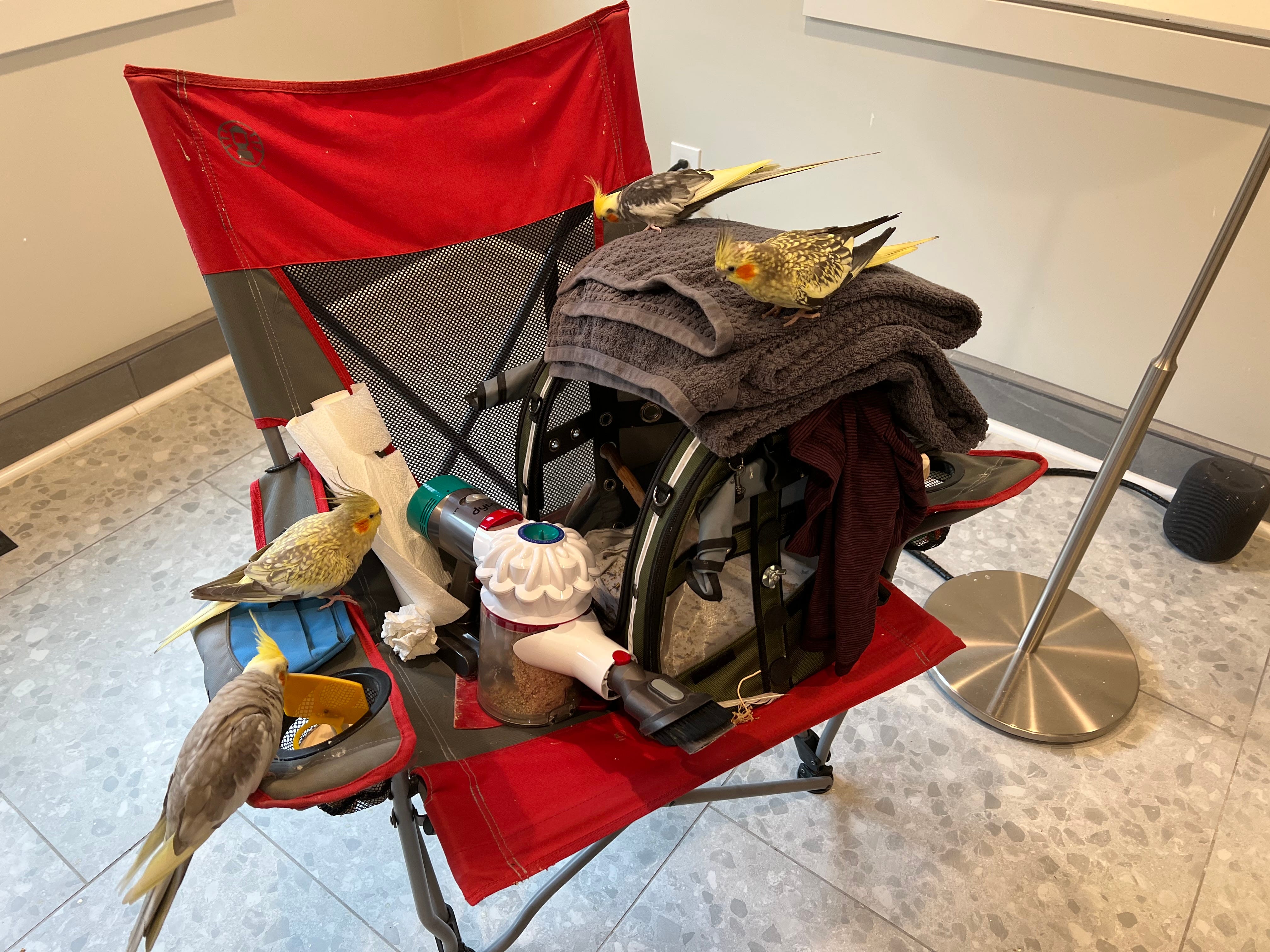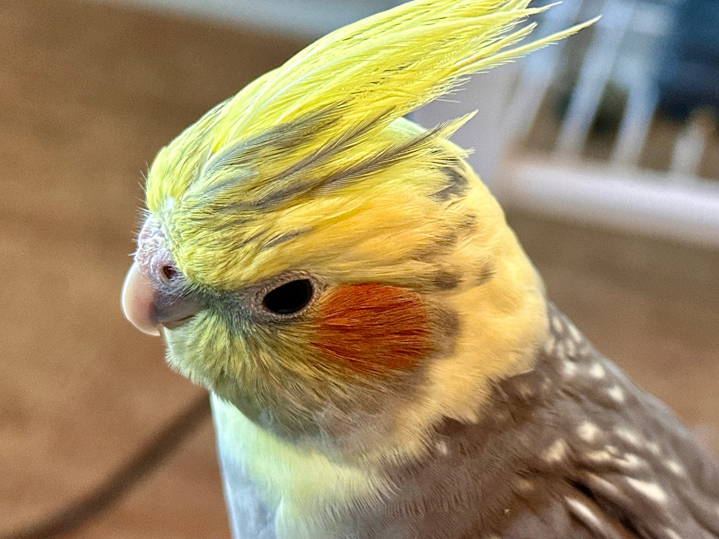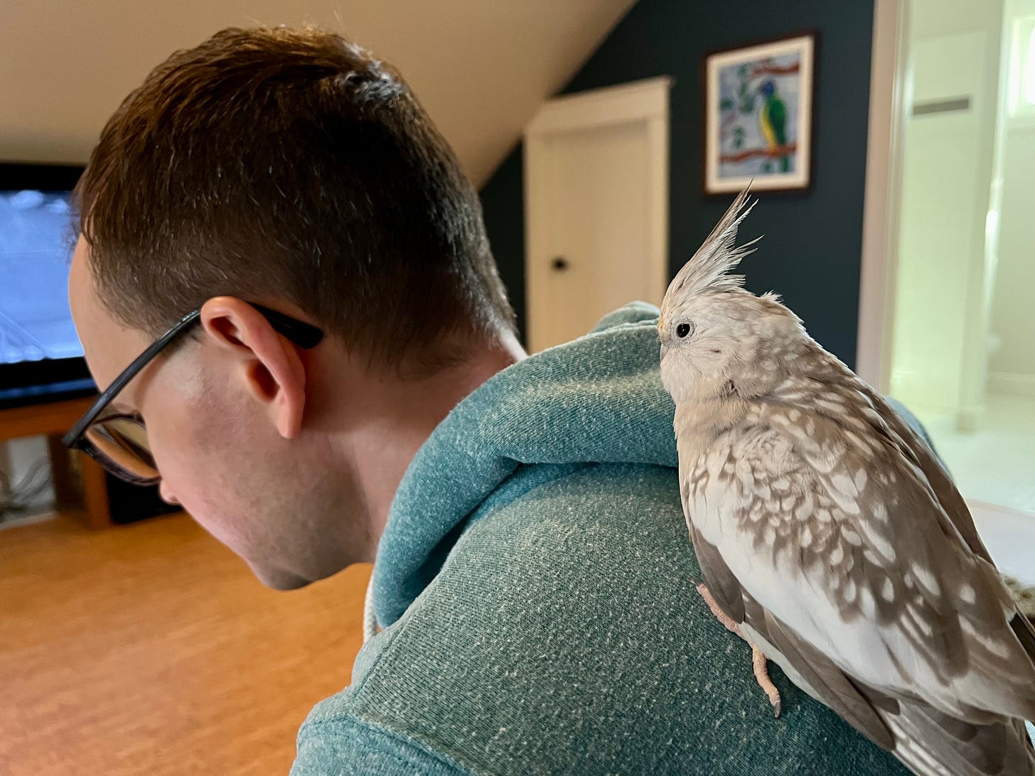 Speaking of old, Betty is now estimated to be 27 years old, which is ancient for a cockatiel. Despite a lot of health problems, she is a pretty happy-go-lucky bird, hanging out with one of us most of the day.