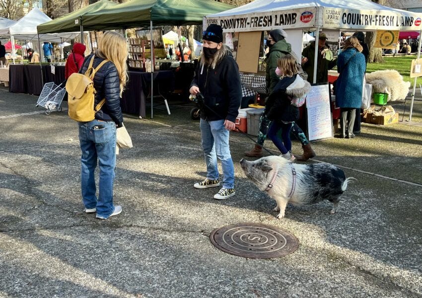 The farmers market is part of the weekly routine. While it caters mostly to humans, other species are also represented.