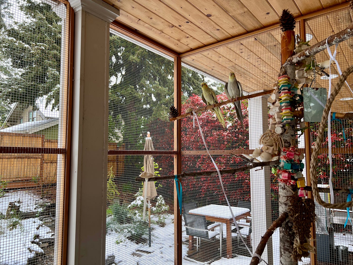 I put together two videos that show what it’s like to be a bird, eating and flying in our aviary.