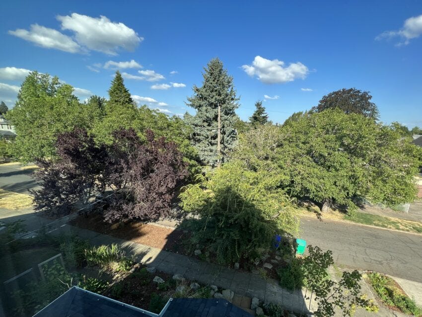 I have my office in the attic, where I’m typing this. I’m lucky to have a fantastic view of the tree-lined streets of Portland. There are six houses across the street, but in the summer I can only see parts of two of them. More than a hundred more city blocks are in the distance.