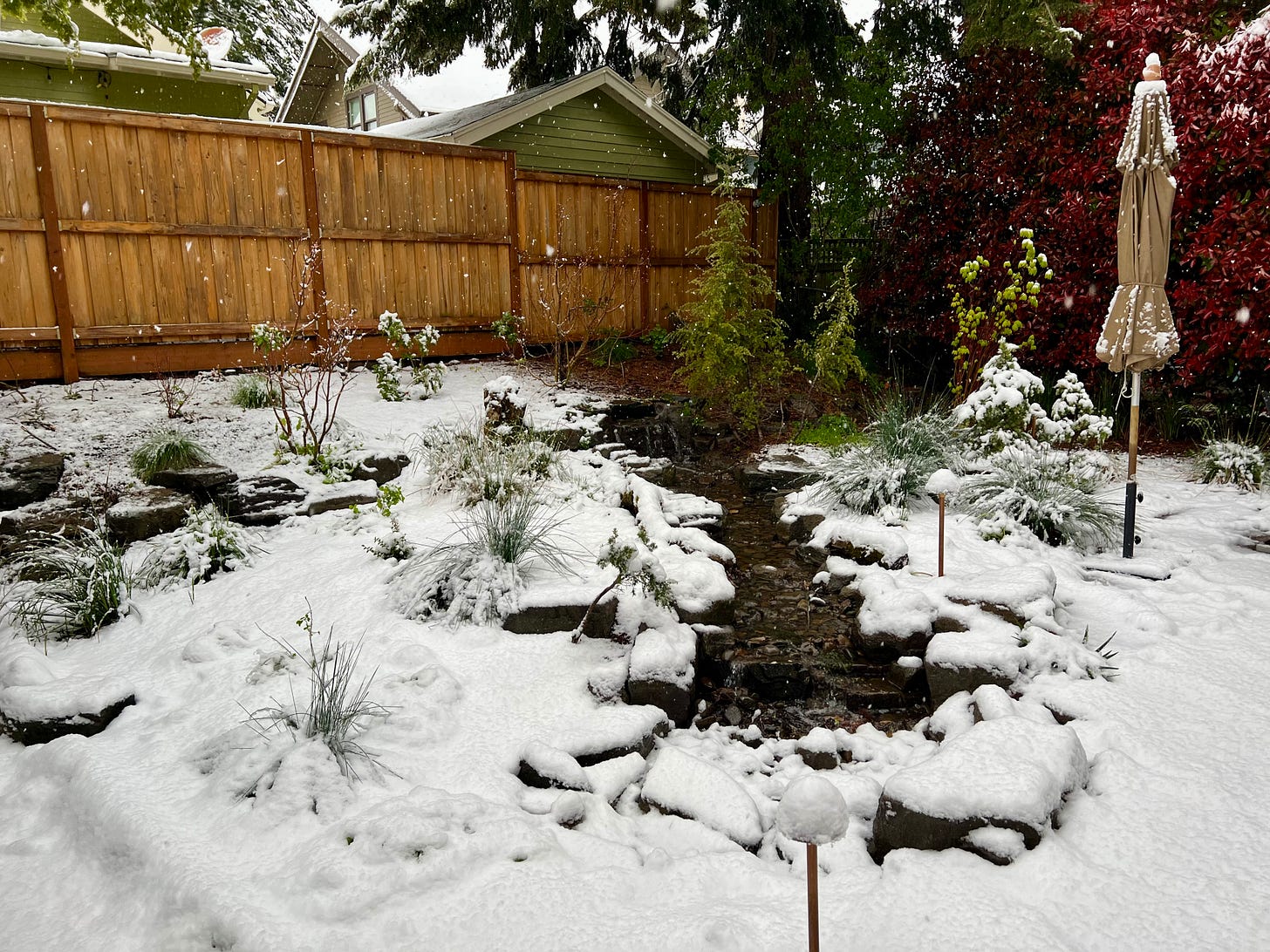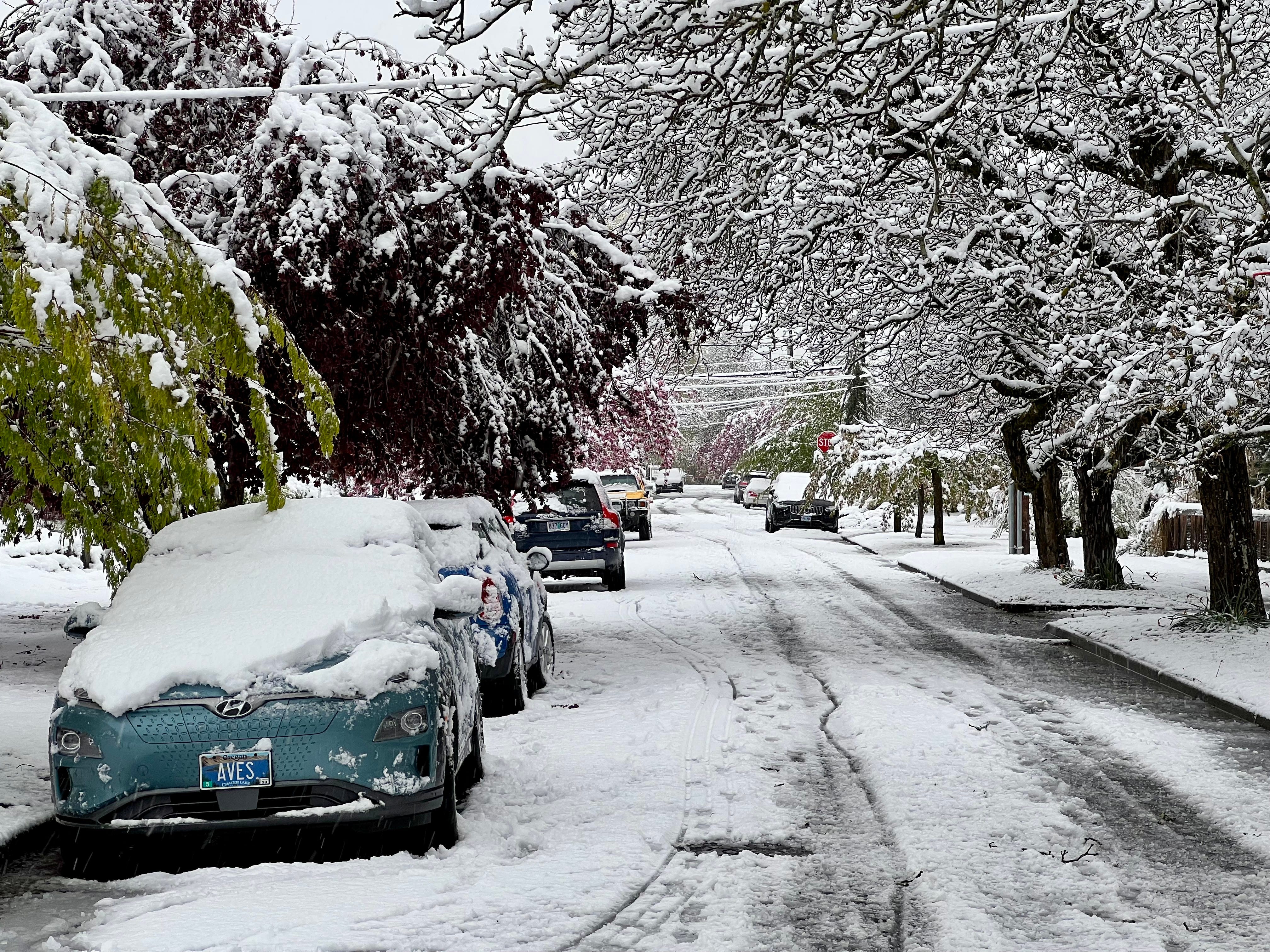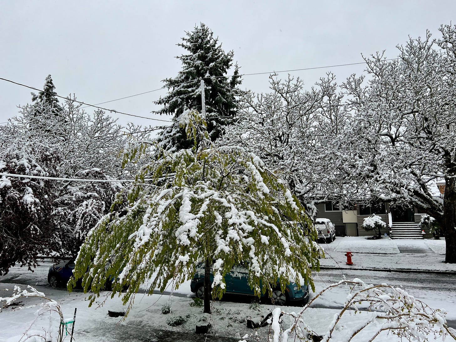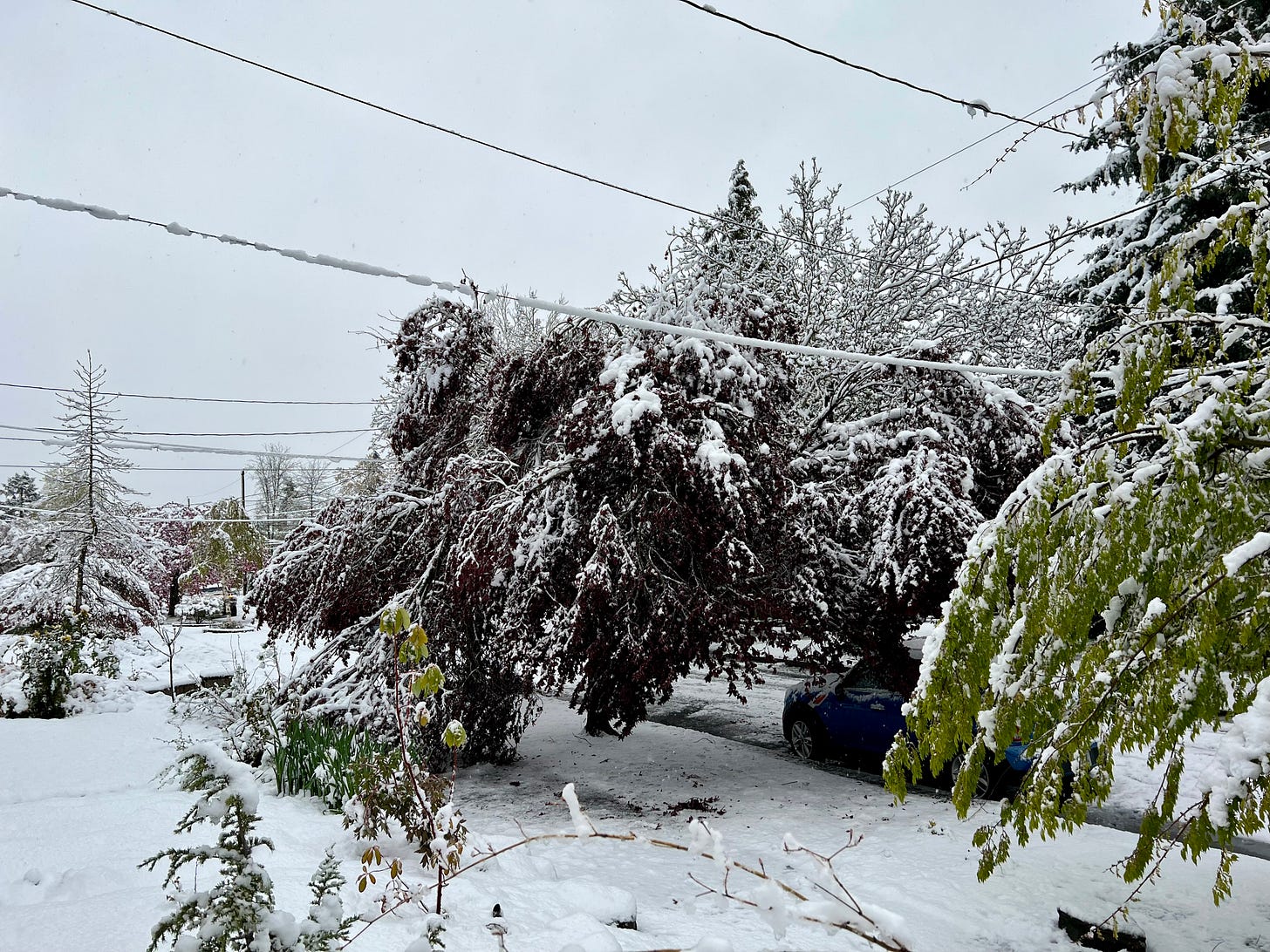 A freak snowstorm blew through in April, the latest snowfall in Portland history. Heavy, slushy snow collected on tree branches, causing significant tree damage. Our next-door neighbour was out before sunrise trying to remove snow from his tree as he saw the branches sagging down to the ground.