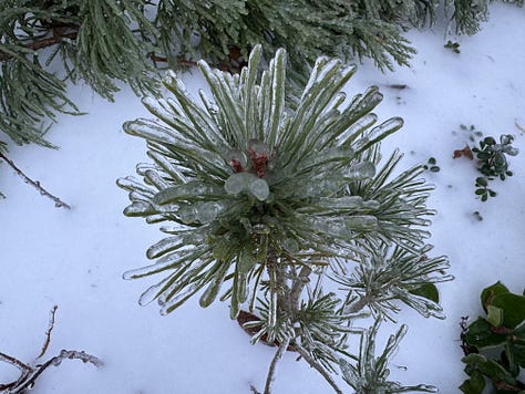 We seem to get at least one ice storm every winter, and this one was especially intense. Everything was coated in a couple of inches of ice for several weeks. Without shoe spikes, it was not really possible to walk around outside. Driving was also pretty tricky even if you had the right car for the conditions.