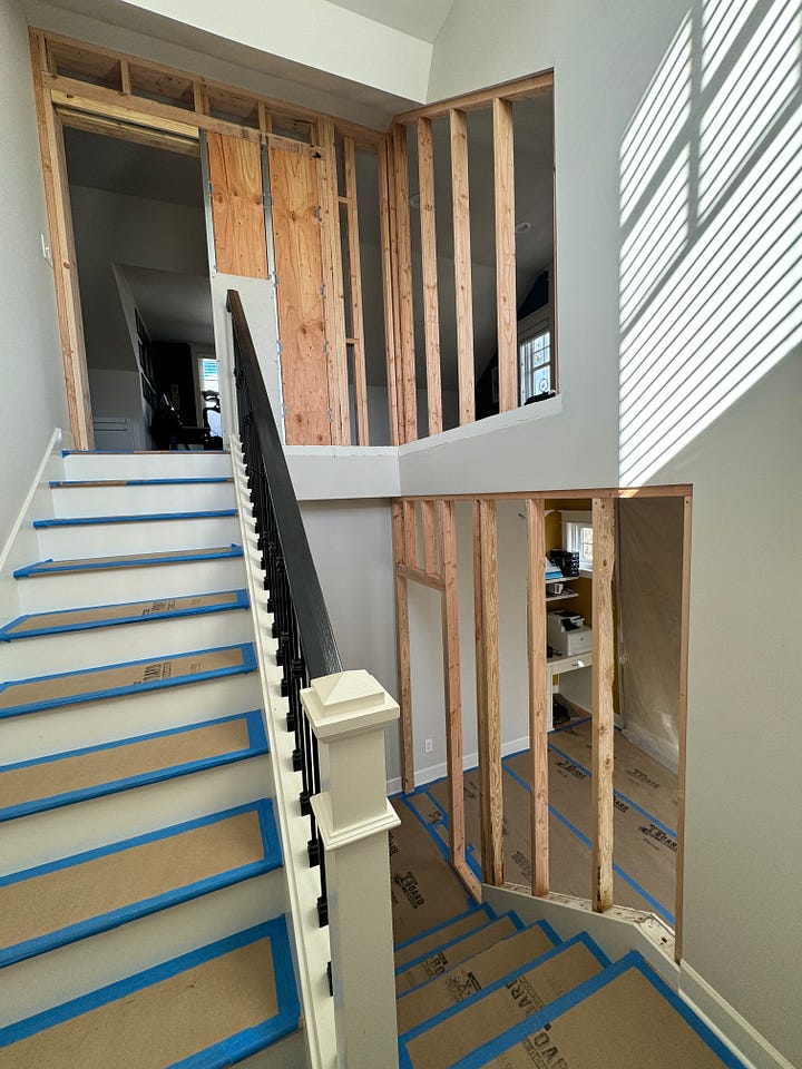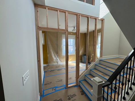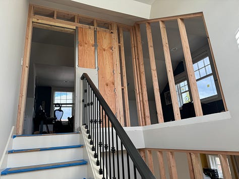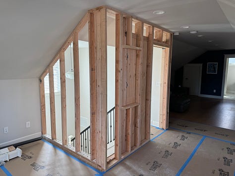 We’ve lived in this extreme open-plan house for many years and have gradually been closing it off to turn it back into a normal home. Our final project was to close off the attic and Eric’s office, to add more privacy and so that sound and heating/cooling can be better controlled. These photos show the framing of the areas that used to be open and are now blissfully separated.