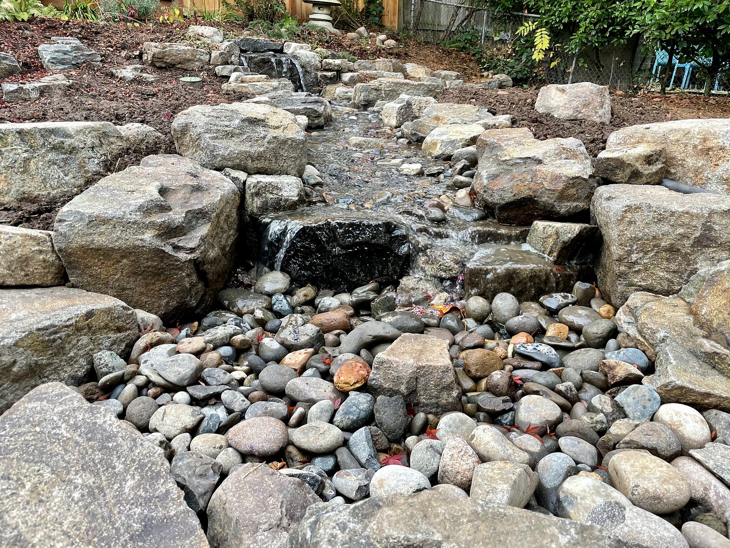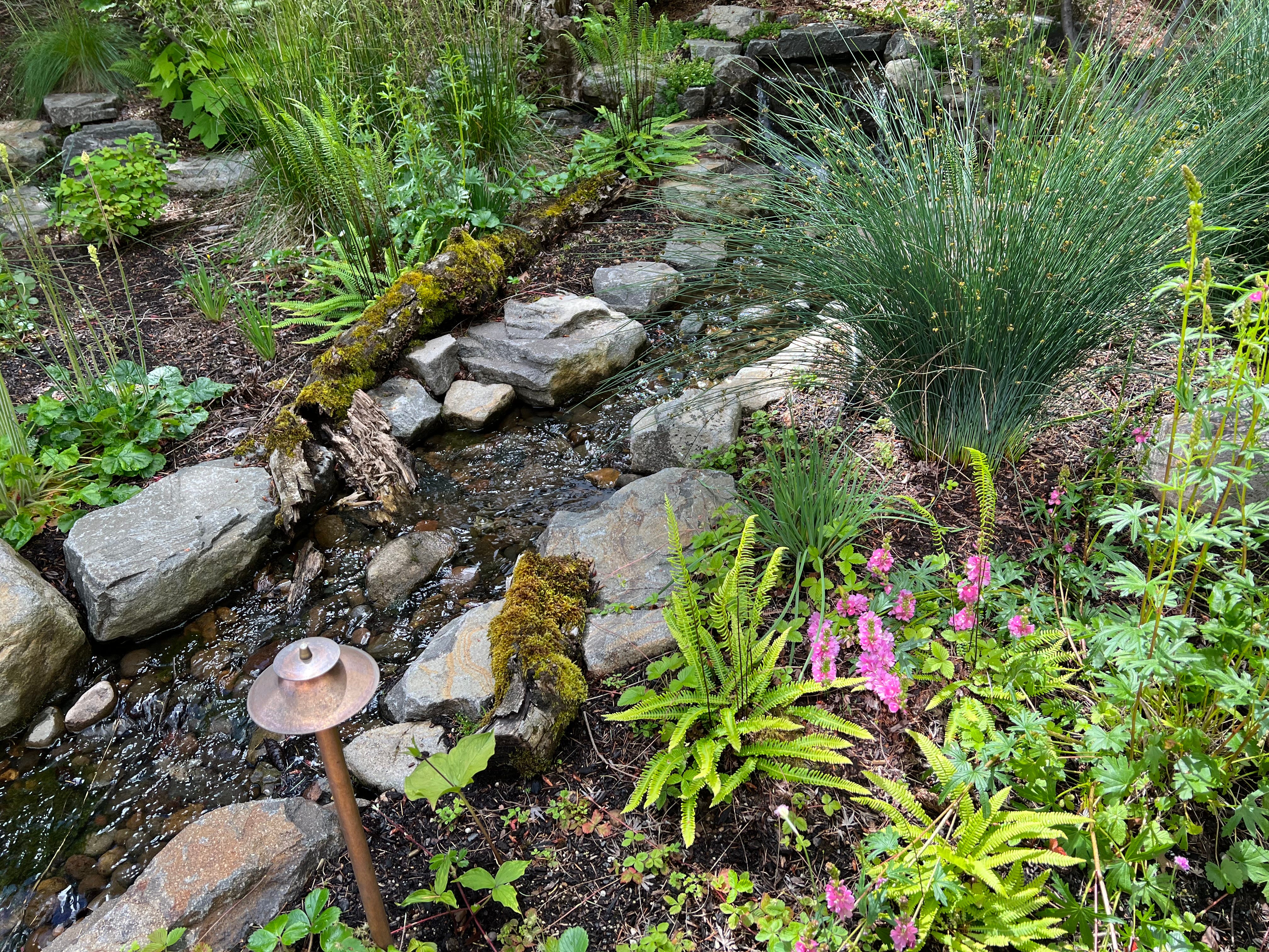 At Erin’s recommendation, we hired Randy Rayburn to implement the design. He did all the rock work, including the creek, patio, front entrance, pathways, and the landscape rocks. He also did most of the planting and worked with Erin on the selection of plants. Our job was mostly to interfere and change our minds.