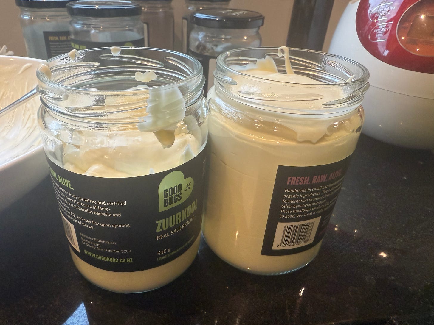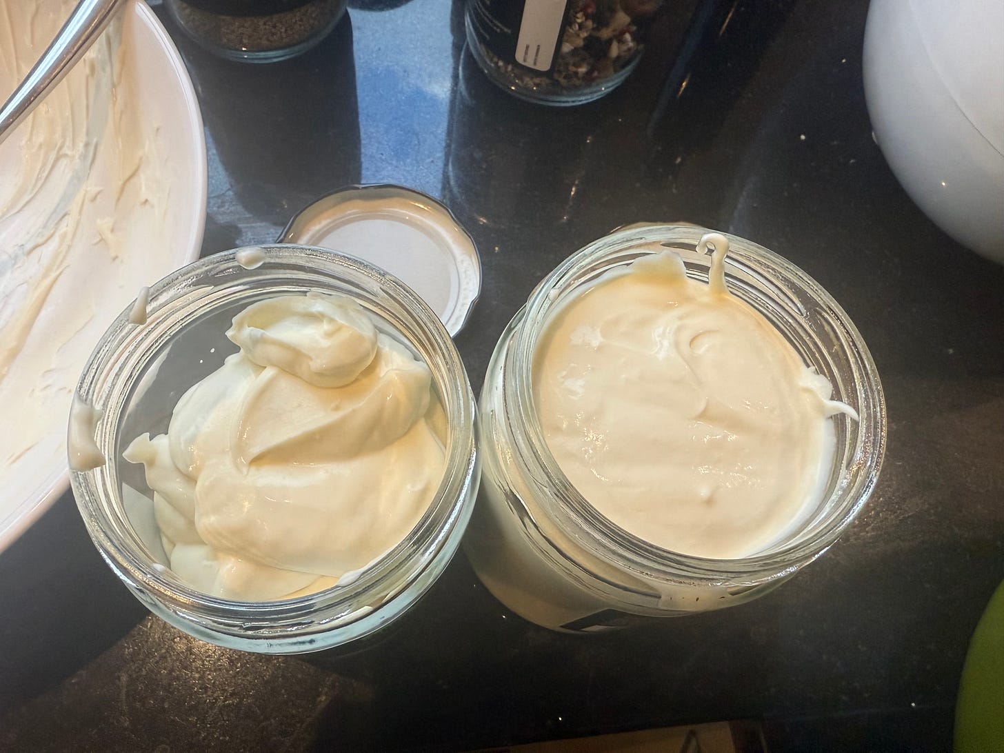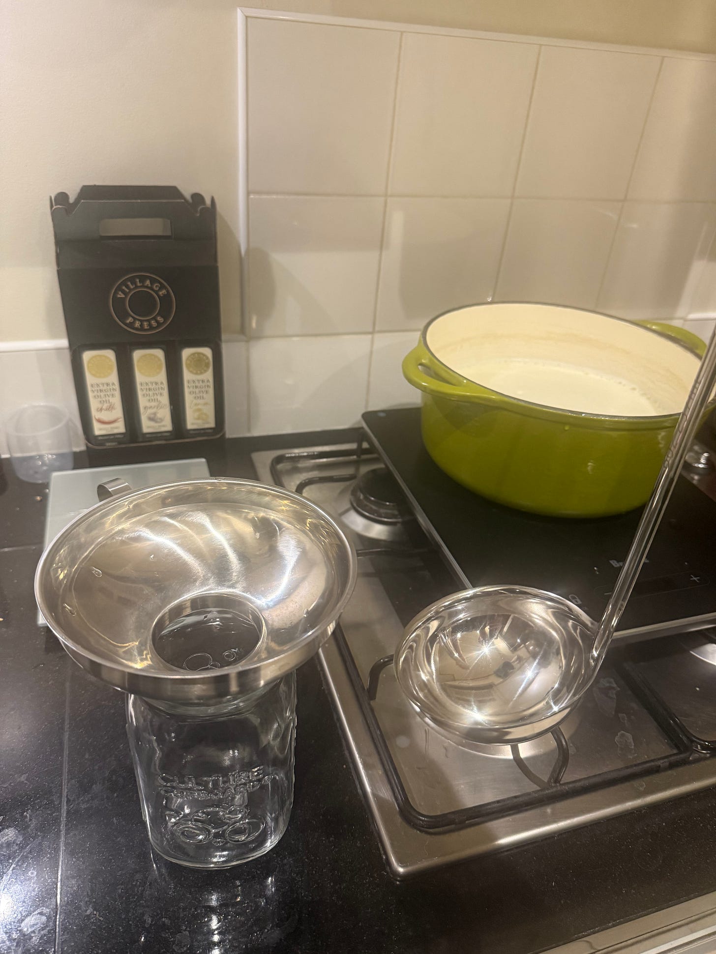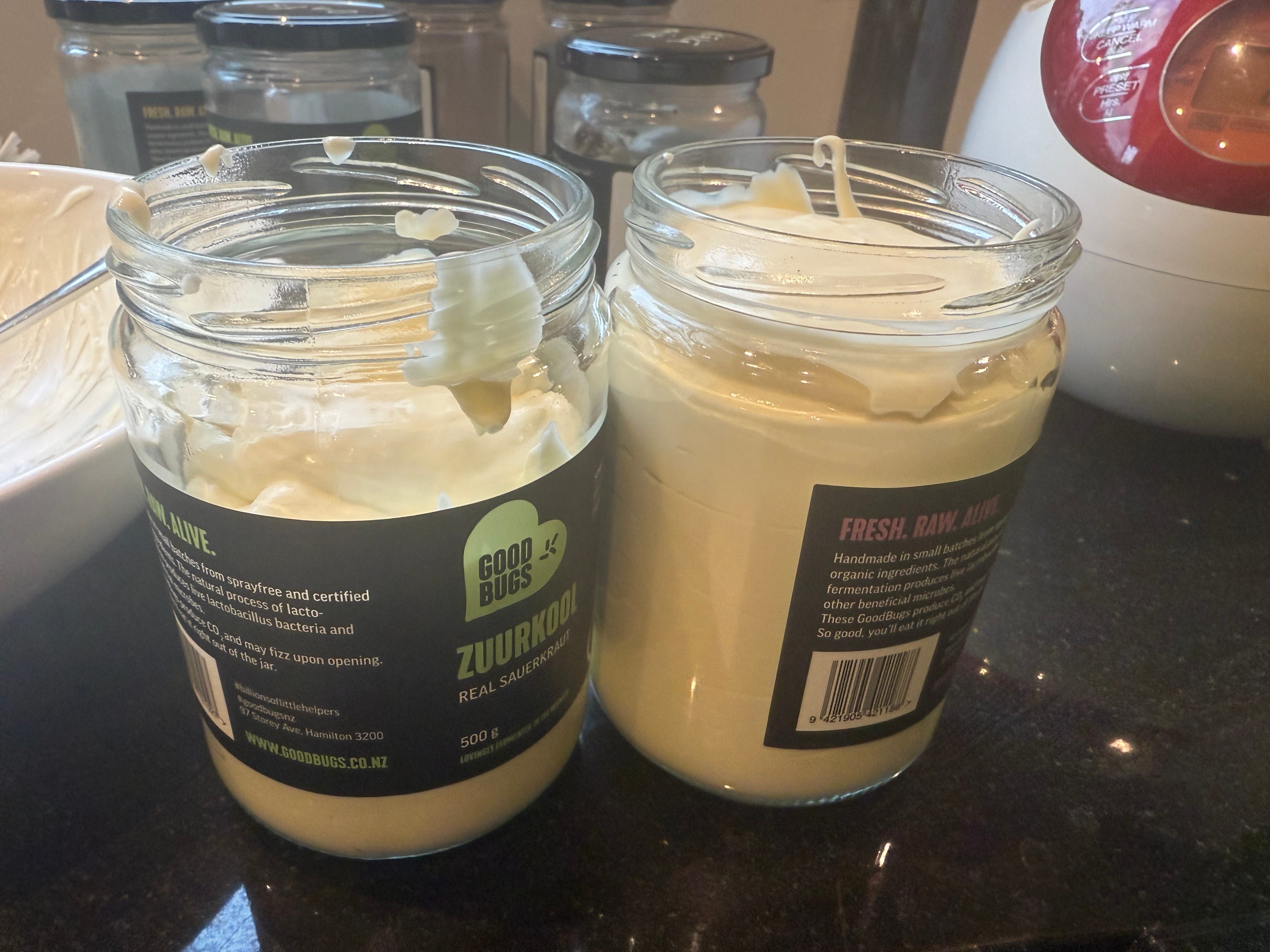 I typically make Greek yoghurt, which is quite thick, so spooning it into my storage jars requires a funnel, but you may find you need one. I’ve been re-using some sauerkraut containers and my recipes mostly fill up two 500ml jars. My latest batch was especially thick, so the second jar was only partially full.