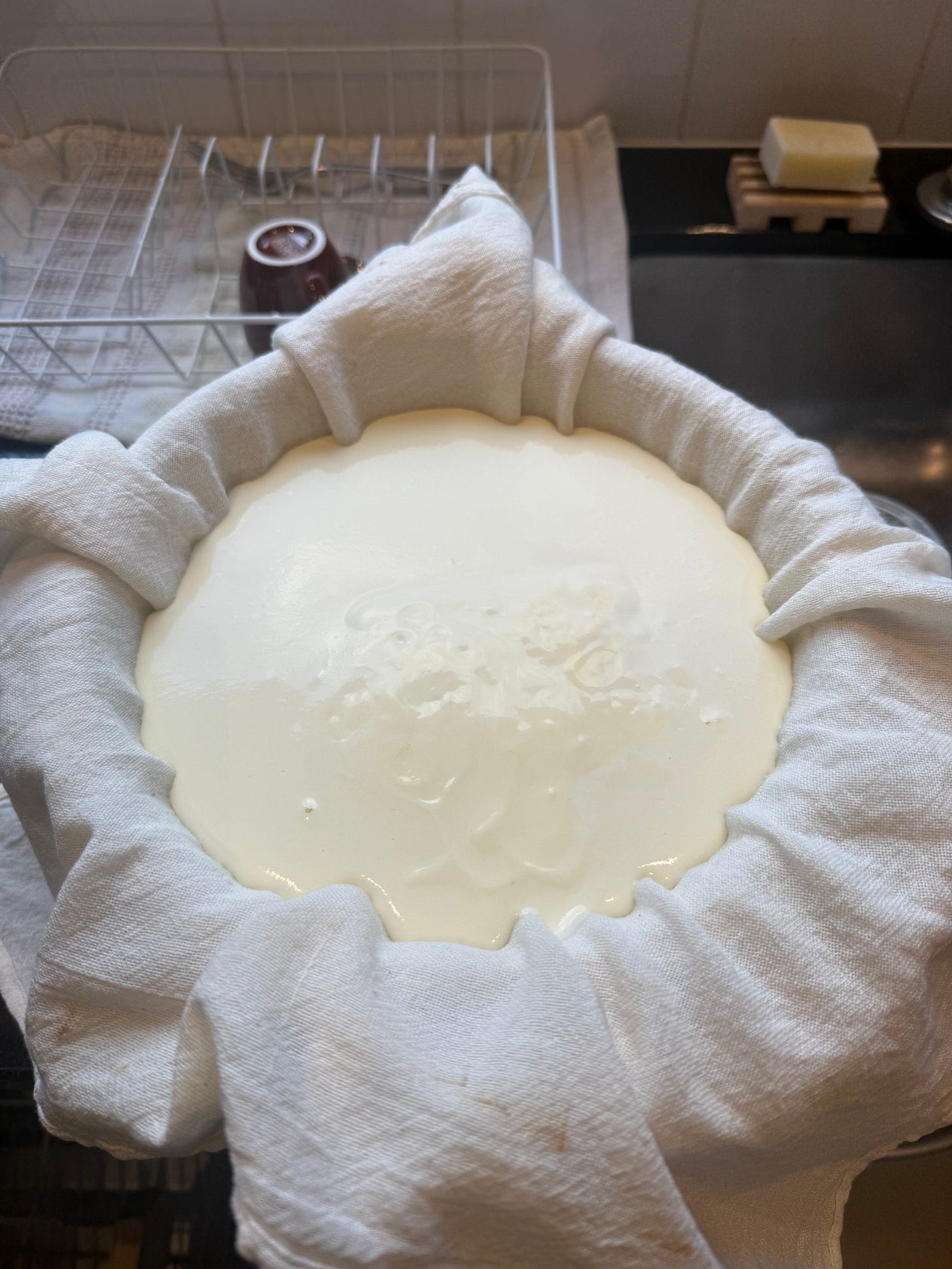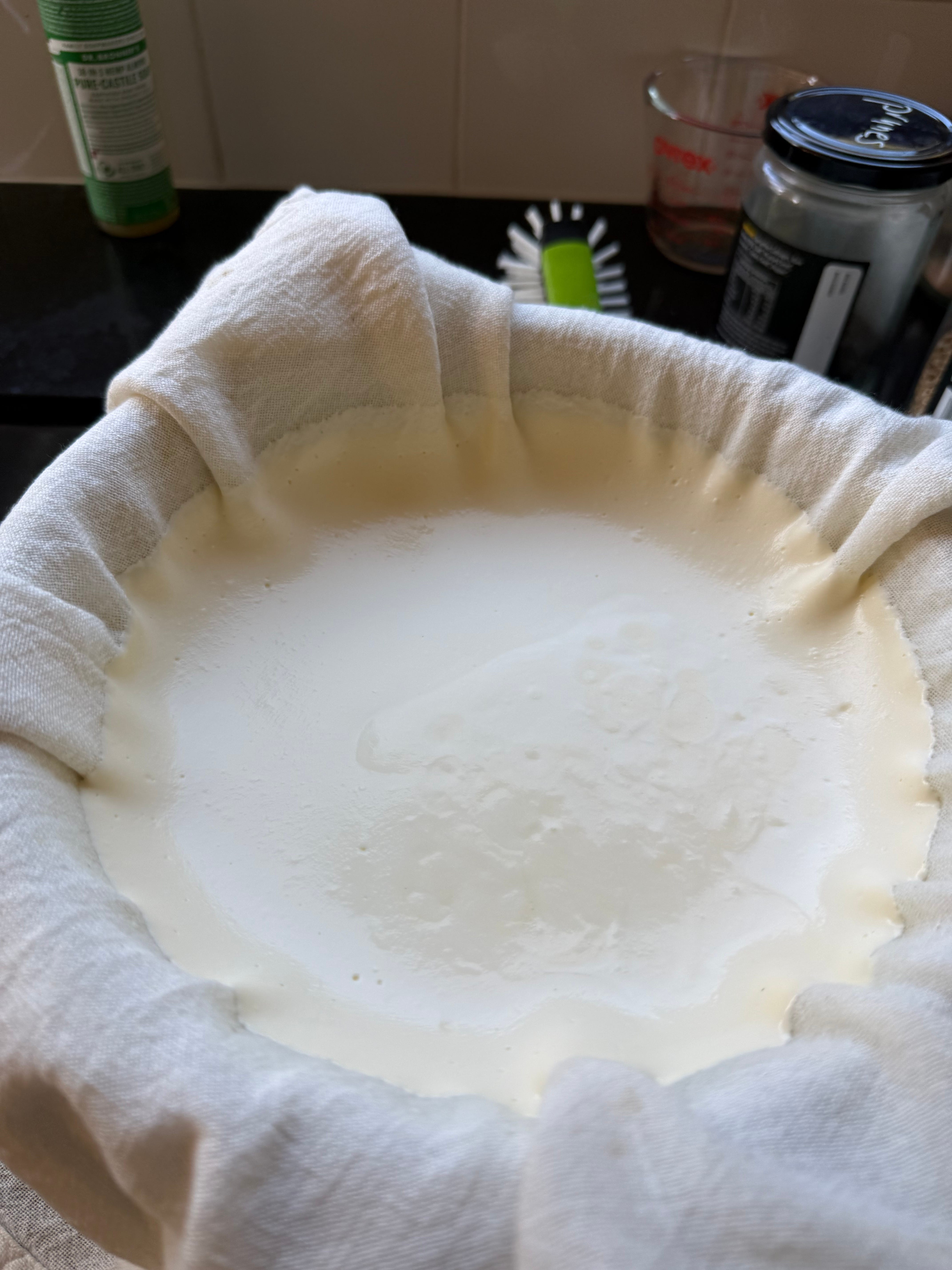 For Greek yoghurt, I re-use my cast iron pot I used for cooking, put the colander inside it, then line the colander with two layers of cheesecloth. I carefully pour the whisked mixture into the lined colander, then put the whole concoction into the refrigerator.