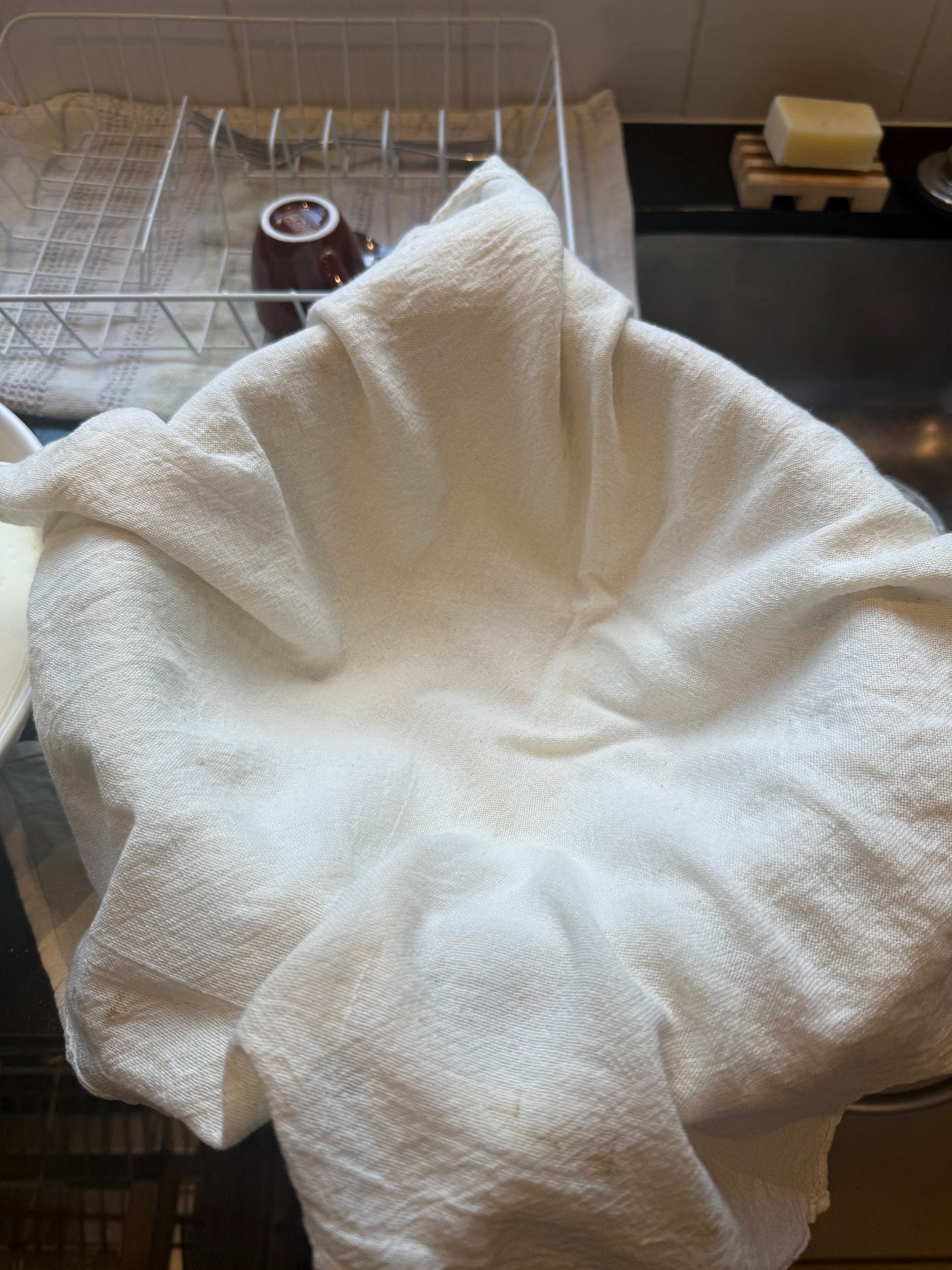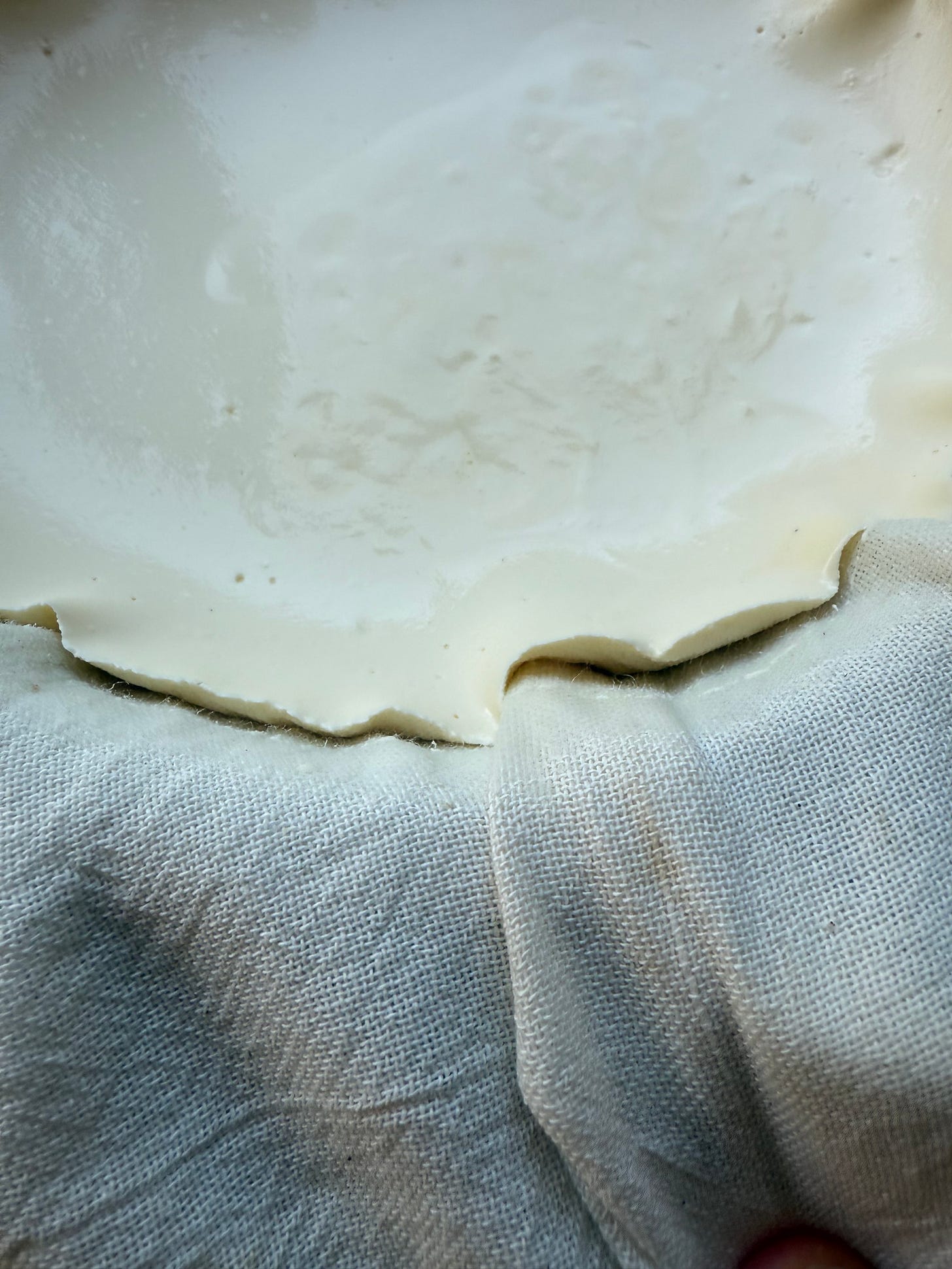 Another visual clue that it’s ready is that the yoghurt will separate from the edge of the cheesecloth if you lift it a bit from the edge. This indicates that it has dried out a bit. It’s much easier to extract the yoghurt from the colander if it’s dry enough, when it will detach easily from the cheesecloth. If it doesn’t separate, it might stick to the cheesecloth when you try to remove it, requiring some scraping.