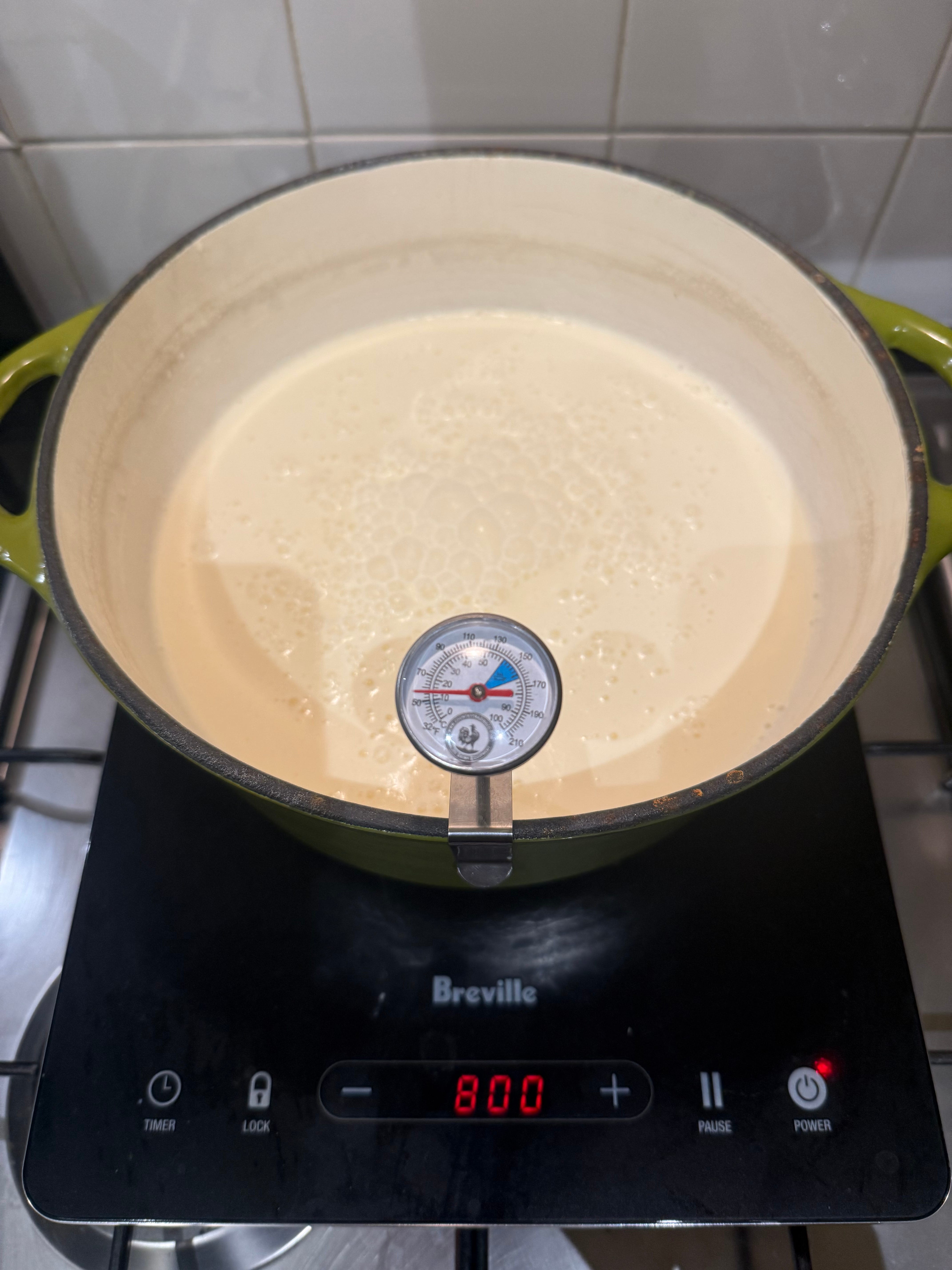 Once the temperature hits 90°C, you can turn off the stove. You have several options for cooling down the mixture to 45°C, which is the target temperature for adding the yoghurt culture.