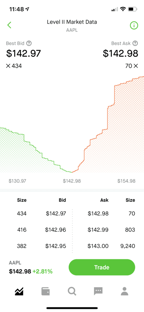 The most interesting part is the list of bids and asks at the bottom. They are arranged in order of price, with the highest bid (buy) prices at the top and lowest ask (sell) prices at the top. It also shows the number of shares.