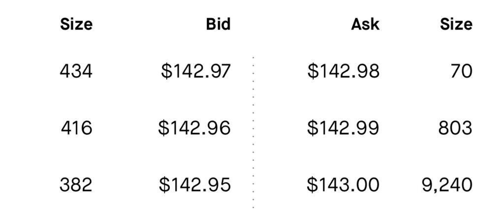 At this point, the buyer finds enough shares from the next seller to complete her buy. The price she wanted was 142.97 and the seller wanted 142.99, so they probably split the difference and the sale is at 142.98—now the stock goes up by 1 cent from the previous transaction.